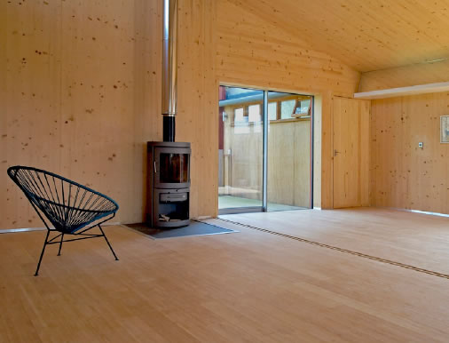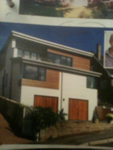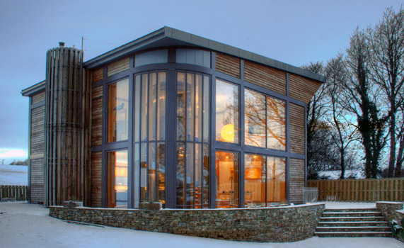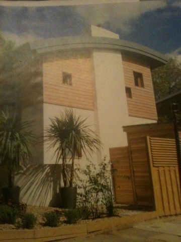 The house, built by www.adaptahaus.co.uk has a steel frame, then wooden and naturally insulated panels. They also have a funky looking system where you can move internal walls about at a future date !