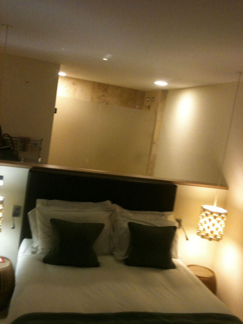 The Scarlet Hotel have maximised the space and superbly put the bathroom behind the beds, so that you look out over the wall, over the bed, out the window and over the beach and sea 🙂