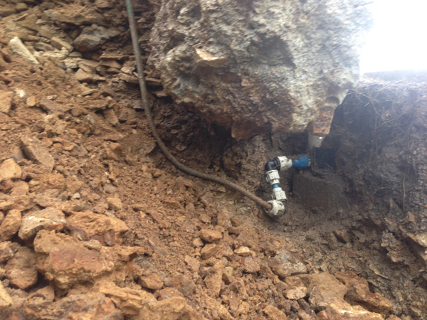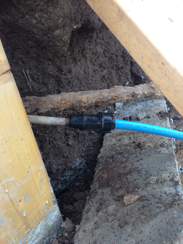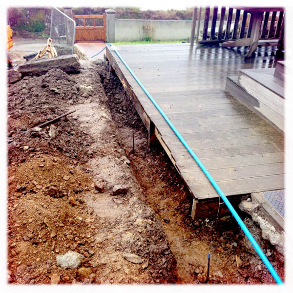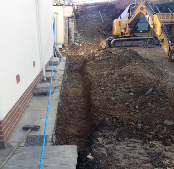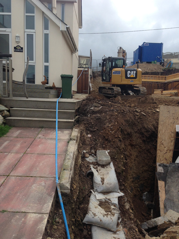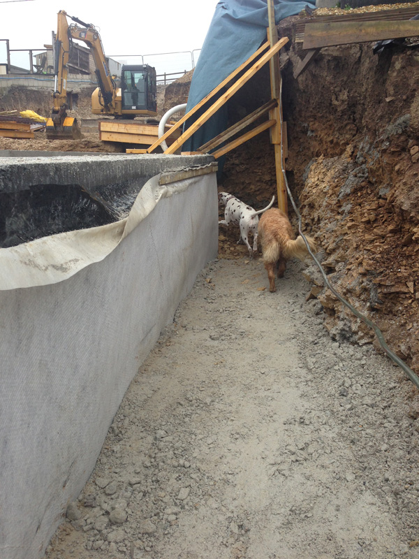 Sam and Nigel (the only 2 on site for a bit over a week) dug under the wall of the neighbours (Kiephius) wall to expose their mains water feed from the street stop valve. This is so that we can replace it with a modern Polypropylene water pipe before it is re-buried.