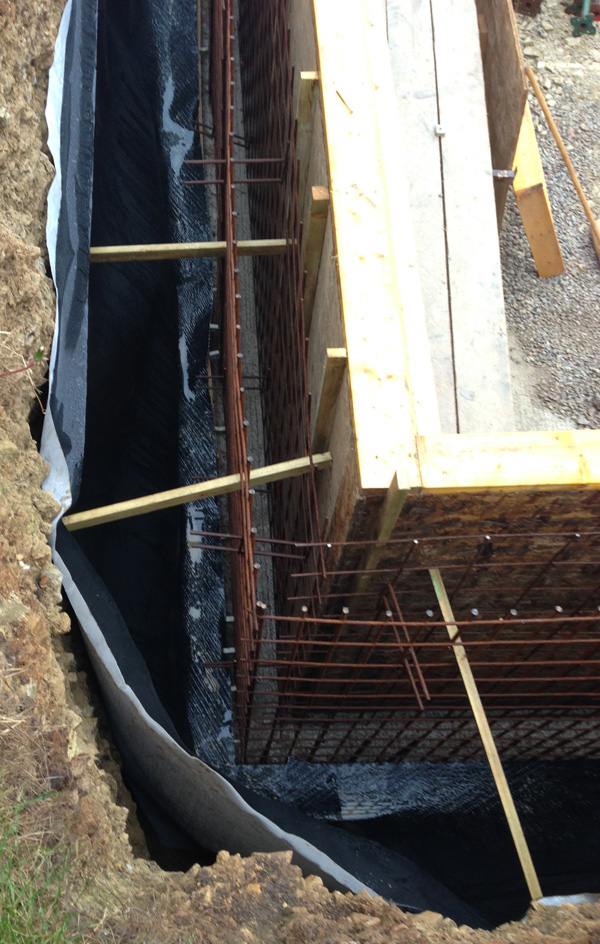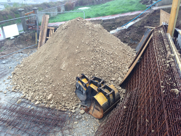 When this first goes up the cover (distance between the steel and the outer edge of where the concrete will exist, so the distance within the concrete the steel will end up) of the steel looks to be a problem, but spacers are put in, to hold it at least 30mm in from the external earth, wood or chippings.