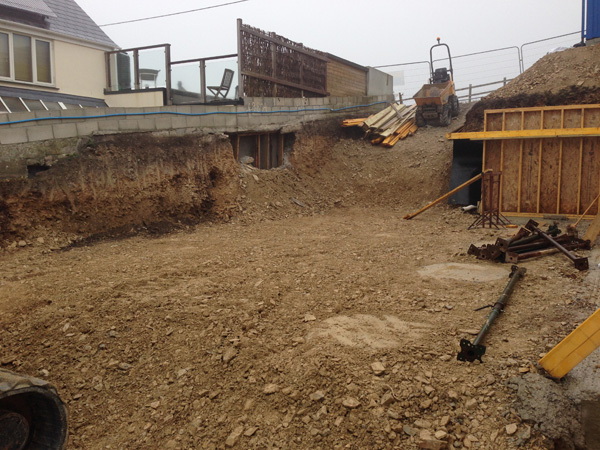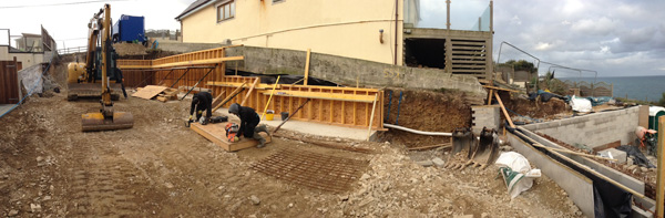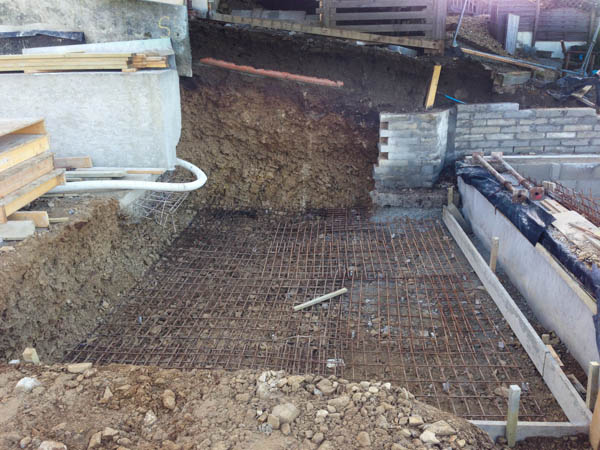 The shuttering going up, with the remaining steel mesh put up against the wall in the garage and the rest of the site cleared (note the back left (SE) ramp dug back) makes the site suddenly big again.