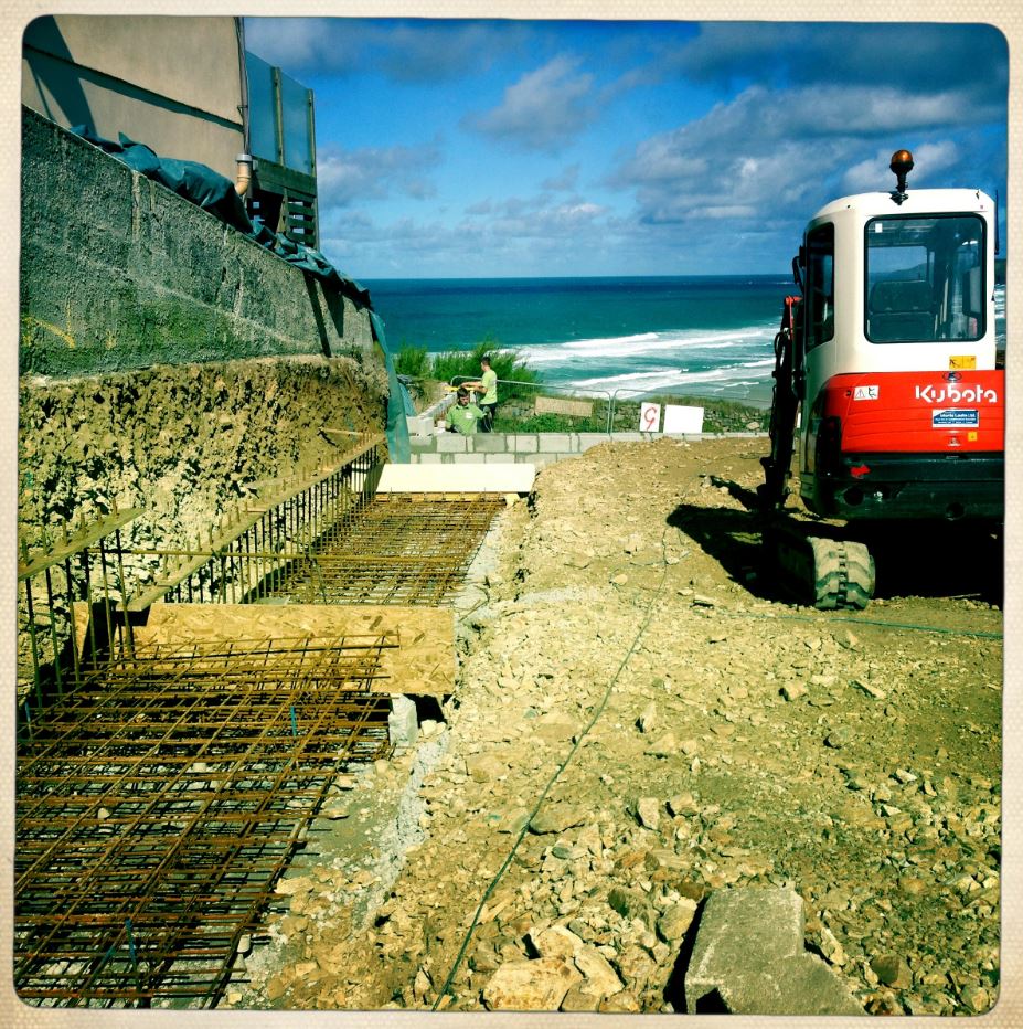 There was a mistake where the vertical re-enforcing bars and wall return for the eastern edge of the garage (just visible in the above photo are the vertical bars to the left of Sam holding the vertical measure) was started about 1m short of where it should be. This was taken down, the steel bars cut. It means the eastern wall will need to be tied into the exiting wall and foundation later on. The communication error between the site team and the chap doing the site layout (Matt) has been highlighted to avoid a similar mistake later on.