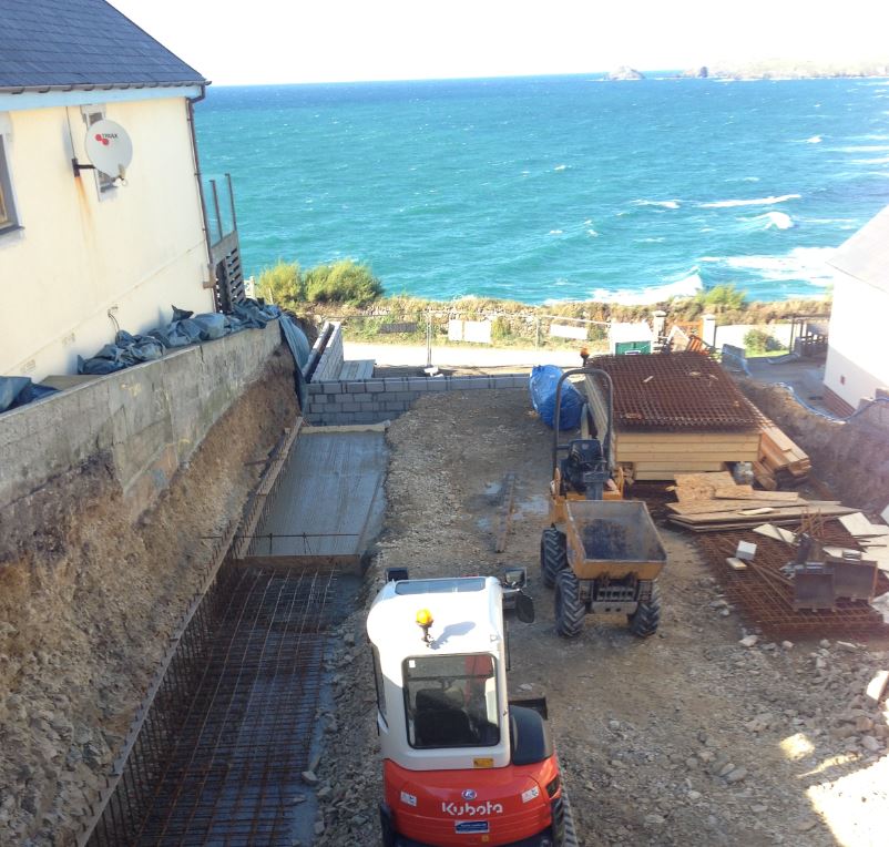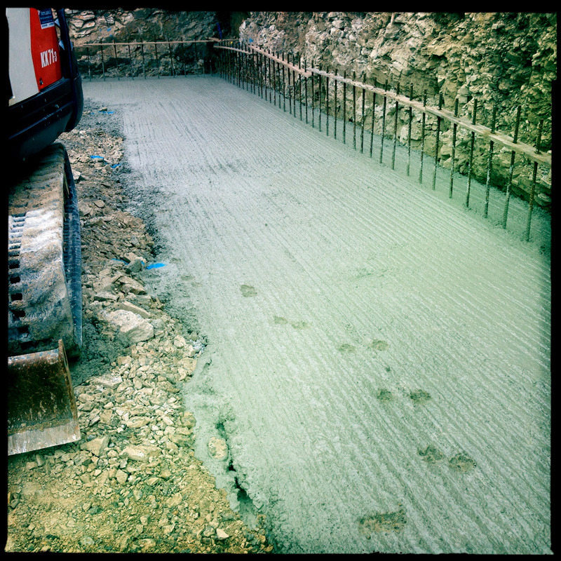 To reduce the risk of this in the next sections of retaining wall a weak cement mix blinding will be put down, so as to create a more level surface on to which the re-enforced mesh and angle bars will lie.